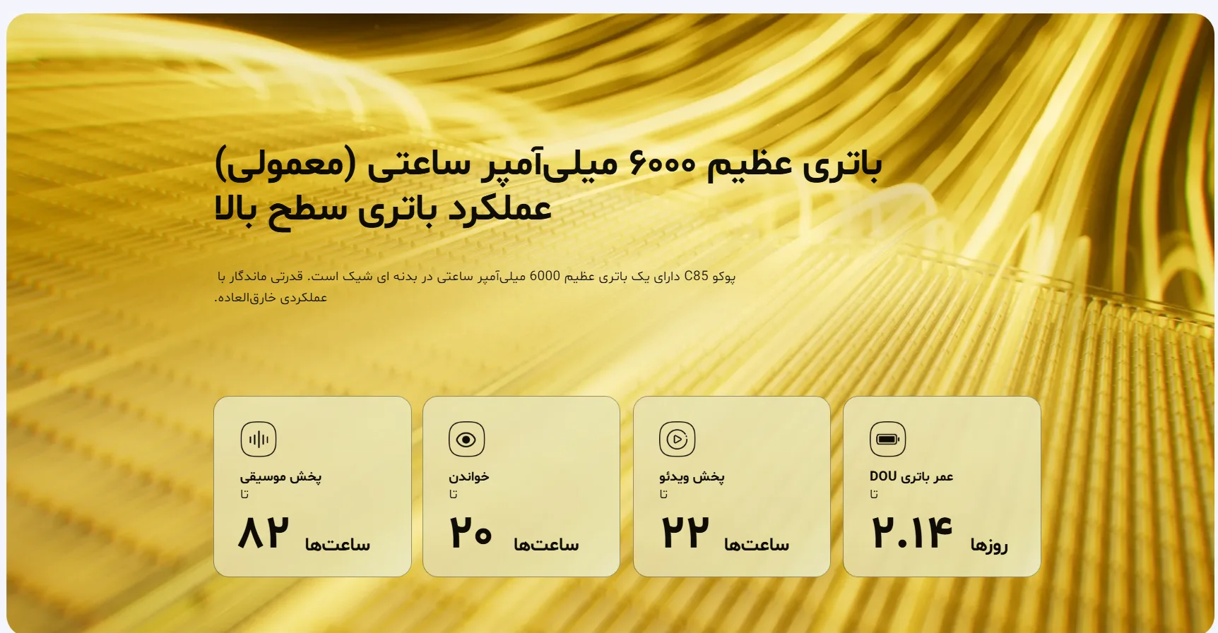 یکی از برجستهترین ویژگیهای گوشی شیائومی پوکو C85 باتری ۶۰۰۰ میلیآمپر ساعتی آن است. این باتری در استفاده معمولی بهراحتی بیش از دو روز دوام میآورد. طبق اعلام رسمی، گوشی تا ۸۲ ساعت موسیقی و ۲۲ ساعت ویدئو پخش میکند.