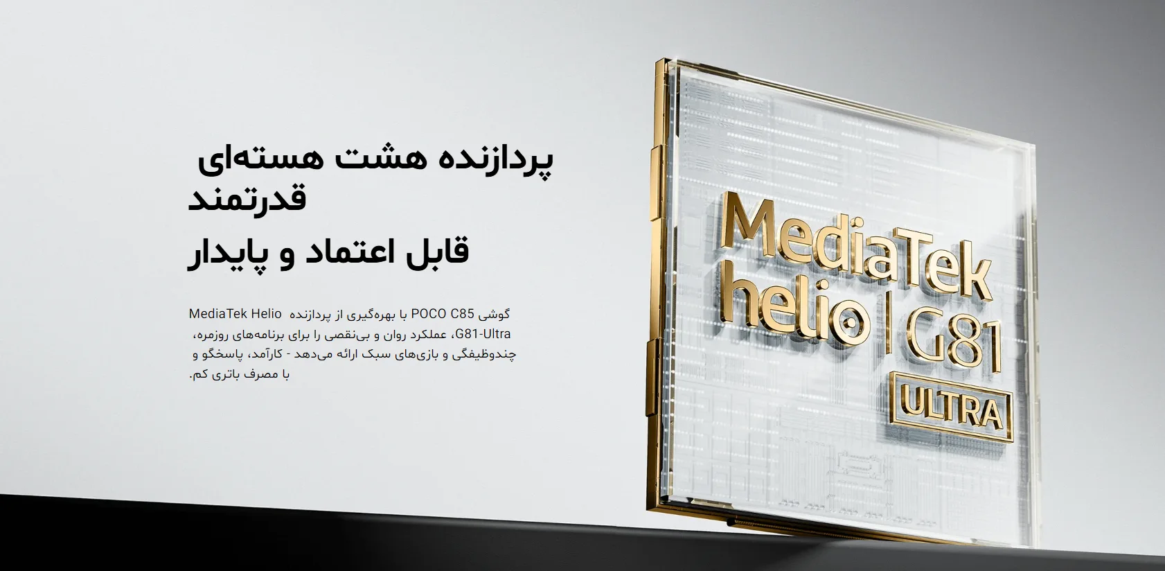 پوکو C85 از تراشه MediaTek Helio G81 Ultra (12nm) بهره میبرد. پردازنده هشتهستهای (۲ هسته Cortex-A75 و ۶ هسته Cortex-A55) به همراه پردازشگر گرافیکی Mali-G52 MC2، برای استفاده روزمره مثل تماس، وبگردی و شبکههای اجتماعی عملکرد خوبی دارد.